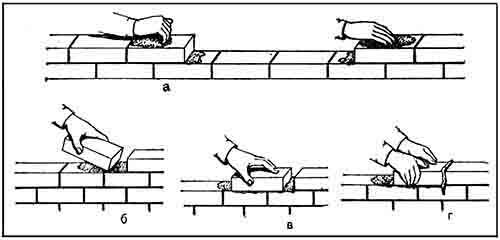 а – наложение и разравнивание рукой глиняного раствора; б – хватка кирпича для укладки; в – подгребание раствора ребром; г – прижатие кирпича на место с выдавливанием раствора