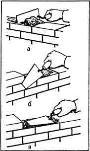 а – наложение раствора с предварительным расстиланием (разравниванием); б – выравнивание раствора по краям кладки; в – разравнивание
