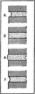 В печной кладке применяют различные виды швов на глиняном растворе (рис. 26). Если кладка будет оштукатуриваться, то для лучшего удержания раствора штукатурки швы оставляют незаполненными или впустошовку, если без оштукатуривания, швы заполняют полностью и раствор сравнивают в одной плоскости с кладкой. Такая кладка называется вподрезку.