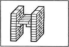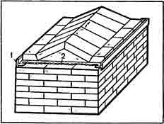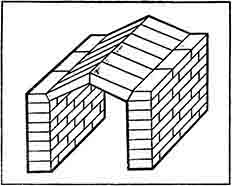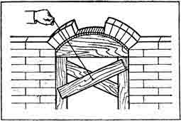 В последний ряд кладки свода или арки вкладывают замковый кирпич, предварительно смазав его с двух сторон глиняным раствором, и с силой вгоняют его между выложенными рядами поленом или деревянным молотком. Обычным молотком кирпич можно расколоть, и удары приходится наносить по уложенной сверху доске. Замковый кирпич, показанный в последующих рисунках может быть заштрихован.