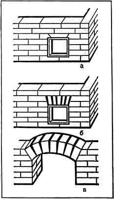 а – кирпичной перемычкой взамок; б – кирпичной клинчатой перемычкой; в – аркой