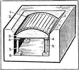 Пологий свод менее крутой, но лучший из них трехцентровый. Он более пологий и лучше излучает тепло на под печи, что весьма важно для выпечки хлебобулочных изделий и варки различной пищи. Под от такого свода нагревается равномерно во всех точках. Имеются более пологие своды, применяемые в хлебопекарных печах.