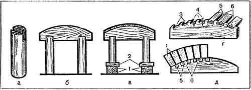 1 – дощатый настил по кружалу; 2 – пята; 3 – кружало; 4 – прогоны; 5 – стойки; 6 – клинья
