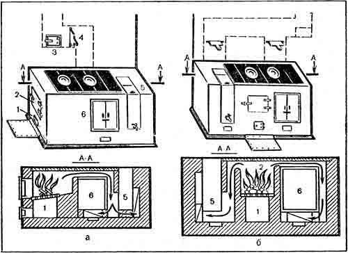 а – кухонная плита с духовкой и водогрейной коробкой, расположенными вместе; б – кухонная плита с духовкой и водогрейной коробкой, расположенных между топливником; 1 – поддувало; 2 – топка; 3 – чистка; 4 – задвижка; 5 – водогрейная коробка; 6 – духовка