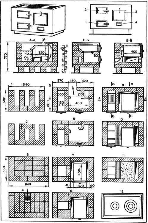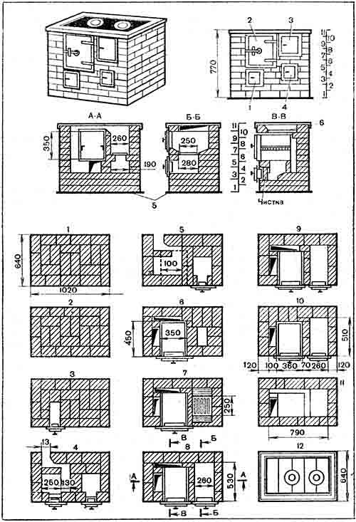 Двенадцатый ряд – завершающий. Его не выкладывают, а только выполняют чугунный настил на тонком глиняном слое и так, чтобы одна из конфорок была над топкой. В этом ряду показаны пять плит с двумя конфорками.