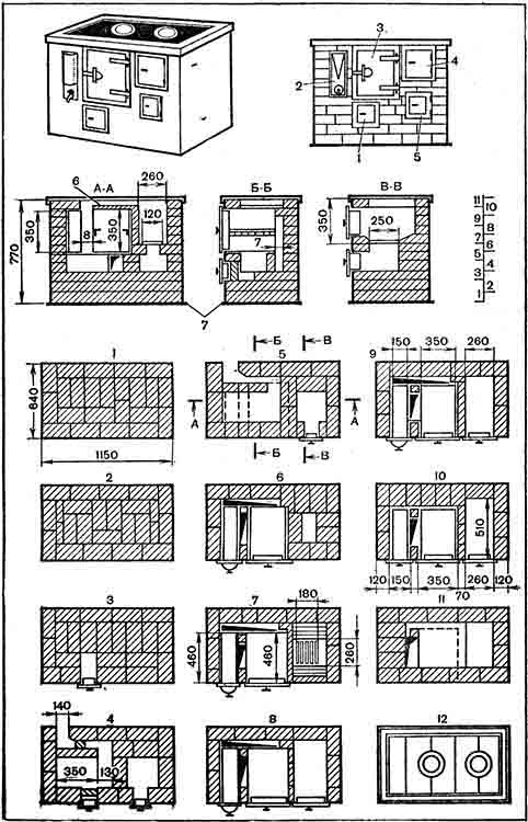 Материалы: кирпич обыкновенный – 185 штук; глина обыкновенная – 3,5 ведра; песок – 2,5 ведра; колосниковая решетка – 250х180 мм; топочная дверка – 250x210 мм; поддувальная и прочистные дверки – 130х140 мм – 2 штуки; пять плит чугунных составных с двумя конфорками 530x180 мм; духовой шкаф 350х530х450 мм; два листа кровельной стали предтопочный – 500х700 мм и под плиту – 1150x640 мм; войлок строительный – 1,2 кг; водогрейная коробка – 150х350х450 мм; обвязка плиты (угловая сталь – 30x30x4 мм – 3,6 м, стальная лента – 2,5х15 мм – 1,2 м); задвижка дымовая – 130х130 мм.