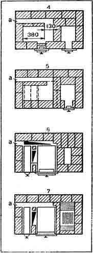 Все рассмотренные кухонные очаги выполнены с отводом дымовых газов с продольной стороны, но иногда их приходится располагать так, чтобы газы выходили с торцевой стороны. На рисунке 53 показаны варианты такого вывода газов для плиты размером 1150х640 мм, то есть с духовкой и водогрейной коробкой. Здесь выкладывают по-другому только четвертый – седьмой ряды, остальные остаются без изменения.