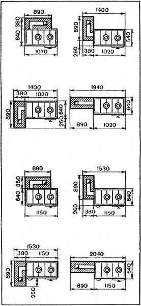 Как было сказано ранее, плиты часто подключают не к дымовой трубе, а к отопительному щитку. Предлагаем варианты подключения плиты размером 1150x640 мм к отопительному щитку размером 890х380 мм. Здесь же даны основные размеры площади, занимаемой плитой и щитком (рис. 54).