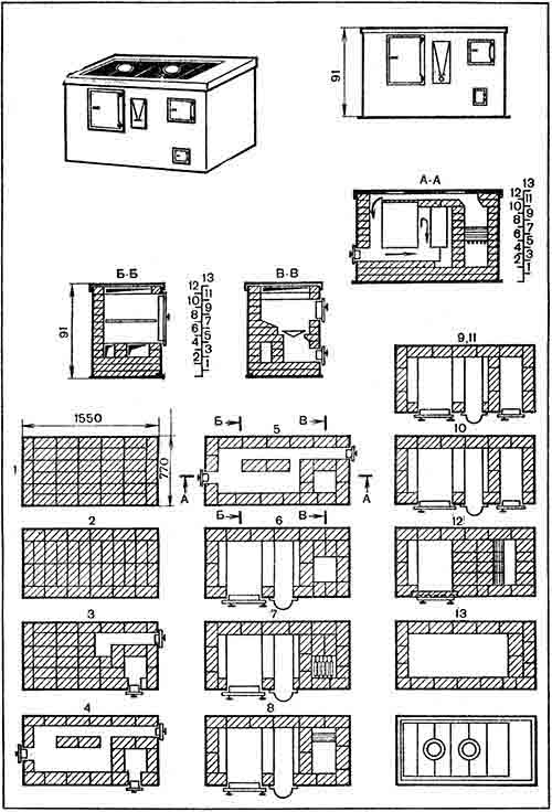Материалы: кирпич обыкновенный – 200 штук; глина обыкновенная – 4,5 ведра; песок – 3,5 ведра; колосниковая решетка – 252х300 мм; топочная дверка – 260x240 мм; поддувальная дверка – 160x170 мм; две прочистные дверки – 150х95 мм; водогрейная коробка – 850х180х420 мм; духовой шкаф – 650х380х400 мм; шесть плит чугунных составных с двумя конфорками 55х20; сталь полосовая 800х100х3 мм; угловая сталь – 30х30х4 мм – 5,1 пог. м; предтопочный лист – 500х700 мм. Если плиту ставят на деревянном основании, то под нее укладывают два слоя войлока, смоченного в глиняном растворе, покрывают стальным листом и крепят гвоздями.
