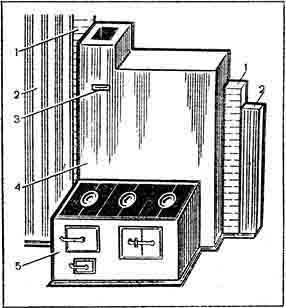 Конструкций щитков очень много. Они бывают с малой и большой теплоотдачей. На рисунке 56 показана кухонная плита 5 с отопительным щитком 4, дымовой задвижкой 3, поставленной в дымоходе трубы, перегородками (стенками) 2, кирпичной разделкой 1, поставленными между щитком и перегородками, толщина которых должна быть не менее 25 см. Этот щиток всегда нагревается отходящими от плиты горячими газами.