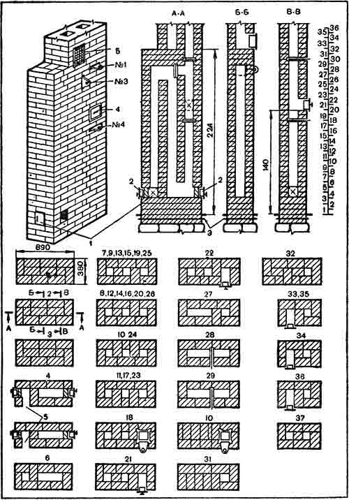 Тридцать третий – тридцать шестой ряды кладут, как показано. В тридцать шестом ряду остаются вентиляционный и дымовой каналы.