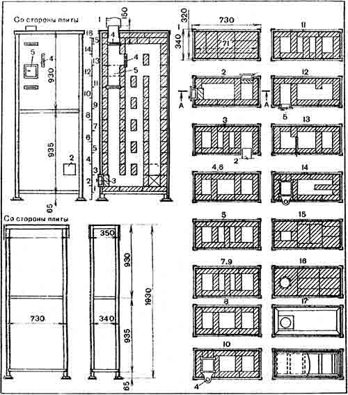 В этом ряду по лицевой (передней) стороне плиты показана ширина (размеры) стенок, приборов и топливника.