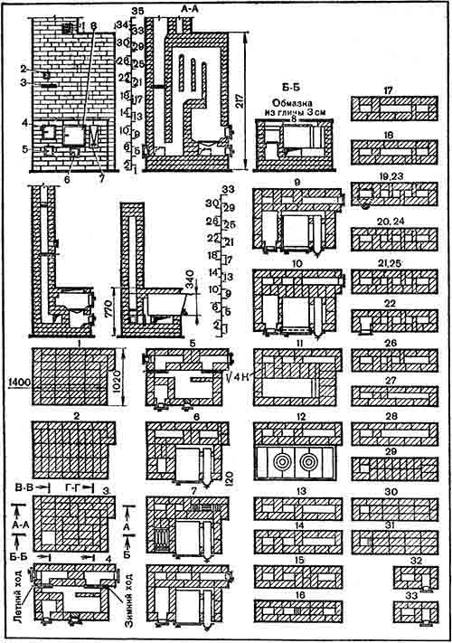 Материалы: кирпич обыкновенный – 309 штук; глина обыкновенная – 6 ведер; песок – 3–4 ведра; три задвижки дымовые – 130х130 мм; три прочистные дверки 130x140, одна из них для самоварника; вентиляционная решетка с клапаном – 150–200 мм; толь для гидроизоляции – 1,5 м.
