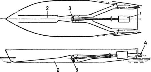 Схема устройства водометного катера: 1 – двигатель; 2 – приемный канал; 3 – пропеллерный насос; 4 – дефлектор.