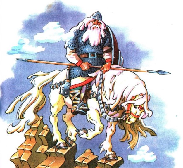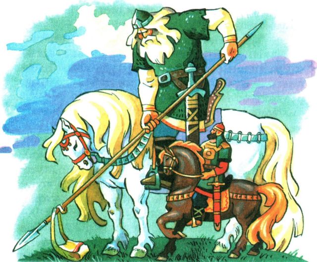 Он нагнулся с седла, ухватил Илью Муромца вместе с конём одной рукой, поднял, оглядел и сунул в седельную суму. Ехал так час и другой. Святогоров конь спотыкаться стал, а под конец на коленки пал. Рассердился, закричал на коня Святогор: