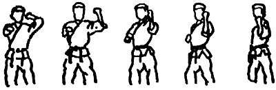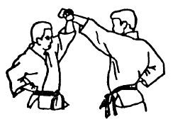 1. Если удар кулаком направлен вам в голову противником, находящимся слева, переместитесь в заднюю стойку и повернитесь лицом к противнику. Одновременно скрестите запястья у правого бедра и поднимите кисти вверх для отражения удара.