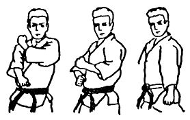 Кулак левой (блокирующей) руки должен находиться на расстоянии около 15–20 см над левым коленом, тыльная часть кулака смотрит вверх.