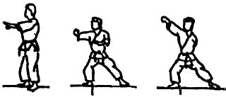 1. Станьте в левостороннюю переднююу стойку, плечи и бедра развернуты прямо вперед, ладонью вниз и поместите левый кулак перед правым бедром, тыльная часть кулака направлена вверх.