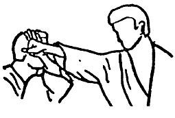 Поместите правую руку около левого уха, тыльная часть кисти смотрит наружу в сторону.