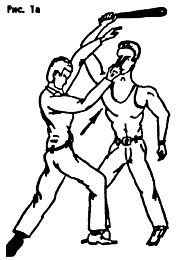 На замахе палкой с шагом подставить свое левое предплечье под вооруженную руку противника и тут же пальцами правой руки нанести резкий удар в глаза. Далее действовать по обстановке: выполнить любой бросок или ударить ногой в промежность. Рис. (1а), Рис. (1б.)