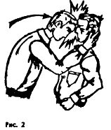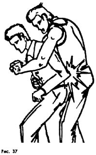 При захвате сзади, когда противник плотно обхватил вас, следует вначале удар каблуком по подъему ноги, потом локтем в живот (рис. 37).