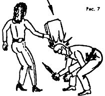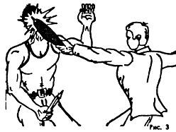 Как вариант защиты от ударов палкой или оружием сверху (сбоку) на (Рис. 3) показан ответный удар в грудь, лицо, зажатым в руке камнем, обломком железа, дерева и т. д.