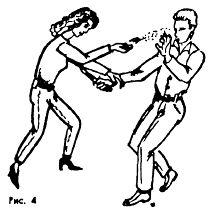 Сложенный зонт может быть использован как подручное средство защиты. Упреждая угрозу нападения противника, ткнуть зонтом в лицо или ударить по голове по руке с ножом (Рис. 3) и, быстро сблизившись, бросить или обезоружить его ударом ноги, рычагом руки, выкрутом оружия, с применением зонта.