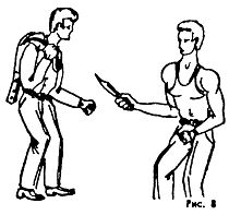 Так, при угрозе нападения можно резко бросить пиджак (куртку) в лицо или на вооруженную руку и сразу перейти к действиям самозащиты. Но лучше с короткого замаха нанести удар сбоку или сверху по голове и далее сблизившись с противником, действовать по обстановке.