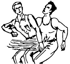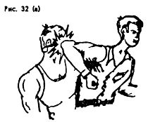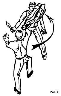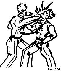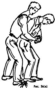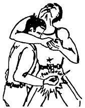 Такое положение ослабляет удушающее воздействие противника. Долго в этом положении находиться нельзя; поэтому следует сразу же начать освобождаться от обхвата шеи, для чего из этого положения можно, ударив локтем в живот или промежность (рис. 38б), резко присесть с падением на спину вместе с противником. На земле освободиться от обхвата полностью, вскочить на ноги и действовать по обстановке.