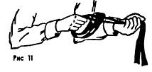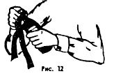Куртка также является хорошей защитой от ударов нунчаками, цепью и т. д. смахивающим движением можно обезопасить себя от этих ударов. Хорошим средством от нападений одного и более противников явялется бутылка на брючном ремне, поясе, веревке и т. д. В считанные доли секунды делается петля и накидывается на горлышко бутылки (Рис. 10), (Рис. 11), (Рис. 12) правильное положение закрепленной бутылки и пояса показано на (Рис. 13)