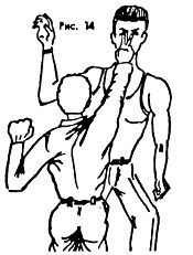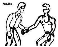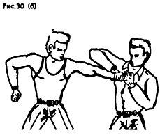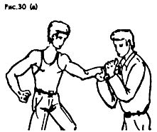 Если после освобождения от захвата противника надо задержать, то целесообразно сразу же после освобождения ударом провести рычаг руки, например, внутрь (Рис. 30 а, б, в).