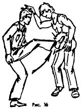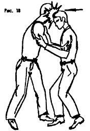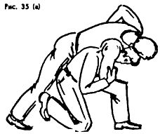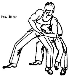 Опасны захваты шеи с головой на удушение. В этих случаях не следует резко вырываться, иначе произойдет собственное удушение. Нужно незаметно, мягко поставить свои ноги за ноги противника, так, как показано на (рис. 38а).