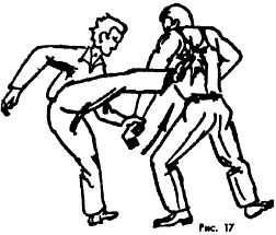 При освобождениях от захватов спереди часто используются удары ногами по различным уязвимым точкам человеческого тела (Рис. 26 а, б), (Рис. 16), (Рис. 17)