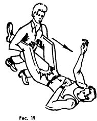 Если противник захватил спереди за плечи, грудь, горло, руки, то для освобождения необходимо нанести основной удар лбом в лицо, пальцами в глаза (Рис. 18), после чего провести бросок с захватом 2 ног спереди, или задней подножкой, или зацепом изнутри (Рис. 19). После броска следует резко надавить коленом в промежность (Рис. 19).