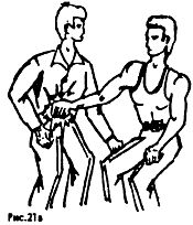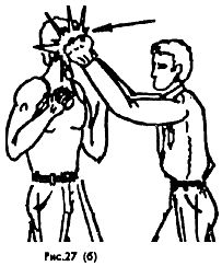 Удушение производится воздействием предплечья на горло снизу вверх резким нажатием, сжиманием или скручиванием головы влево, вправо (Рис. 25), смотря по обстановке.