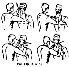 Для освобождения от захватов спереди помимо ударов рекомендуется пользоваться различными надавливаниями: на основание носа, околоушные впадины, глазницы, а также сжиманием нижней губы, грудино-ключично-сосковой мышцы в области шеи (Рис. 22 а, б, в, г).