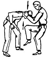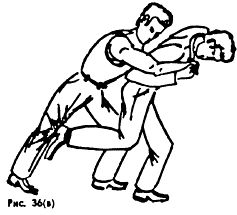 В данной ситуации, например, перебросить противника через себя вперед невозможно, ибо быстрее произойдет собственное удушение, но пытаться нанести удары локтем, ребром ладони в борьбе, с уходом в сторону, следует. Если сразу после обхвата освободиться бросками не представляется возможным, надо использовать различные удары.