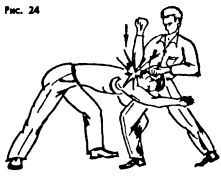 При захвате спереди за ноги следует отрабатывать: броски через спину (но здесь есть элемент собственного падения на землю, что очень опасно!), удары коленом в лицо, грудь и удар локтем в спину – по позвоночнику (очень эффективен, рис. 23 а, б; рис. 24) или захват головы противника на удушение.