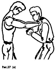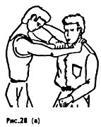 Не рис. (27 а, б) показан простой способ освобождения от захвата горла: ударом обеих рук снизу сбить или сверху (Рис. 28а, б,в.) захват и нанести кулаком, локтем удар в лицо.