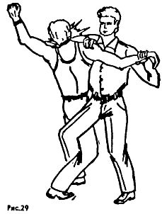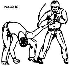 На (рис. 29) показан способ освобождения от обхвата туловища спереди. Нанести удар головой в лицо или надавить основанием ладони снизу в подбородок (нос); можно после этого нанести удар правым коленом в промежность или сразу выполнить бросок задней подножкой.