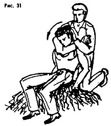 Оказывать сопротивление нужно уметь в любых ситуациях, даже если противник захватил сзади на удушающей прием с нажимом на затылок (Рис. 31).