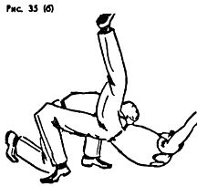 Броски можно выполнять, как через себя вперед (с захватом руки на плечо), (рис. 35 а, б), так и назад на спину с захватом ноги снизу (между своих ног).