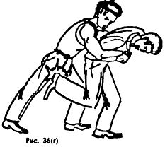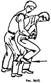 или снизу-вверх каблуком в промежность (Рис. 36 г).