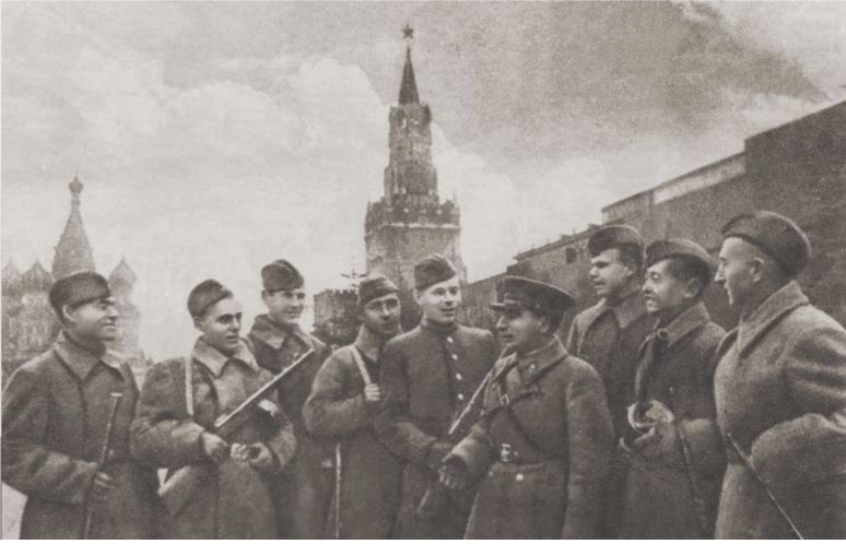 Из газеты: «Это группа представителей различных национальностей СССР – курсантов Московского краснознаменного пехотного училища на Красной Площади в Москве. Слева направо: узбек Хасан Ташбулат, грузин Дмитрий Кодогадзе, литовец Казимир Маркунас, армянин Оган Чубарьян, украинец Николай Зиненко, азербайджанец Джаваншир Джафаров, русский Алексей Веремеев, казах Наббохалит Нургалиев, белорус Павел Реут». Фото С. Фридлянда. 1 ноября 1942 г.