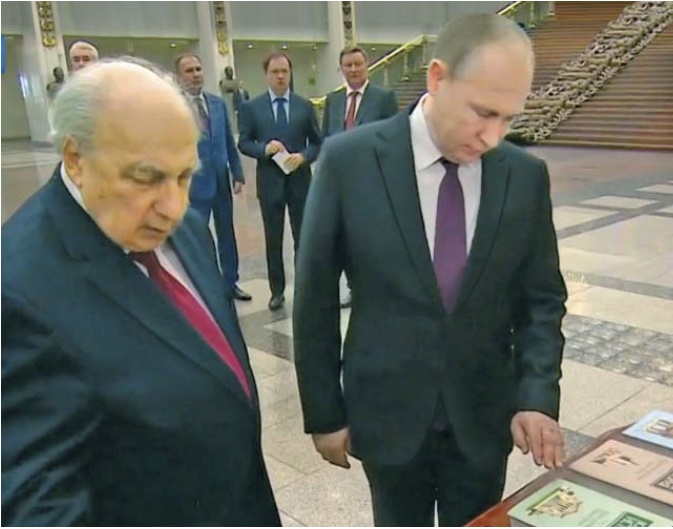 Президент России В.В. Путин знакомится с шеститомной «Всемирной историей» в Музее Победы на Поклонной горе. 4 апреля 2019 г.