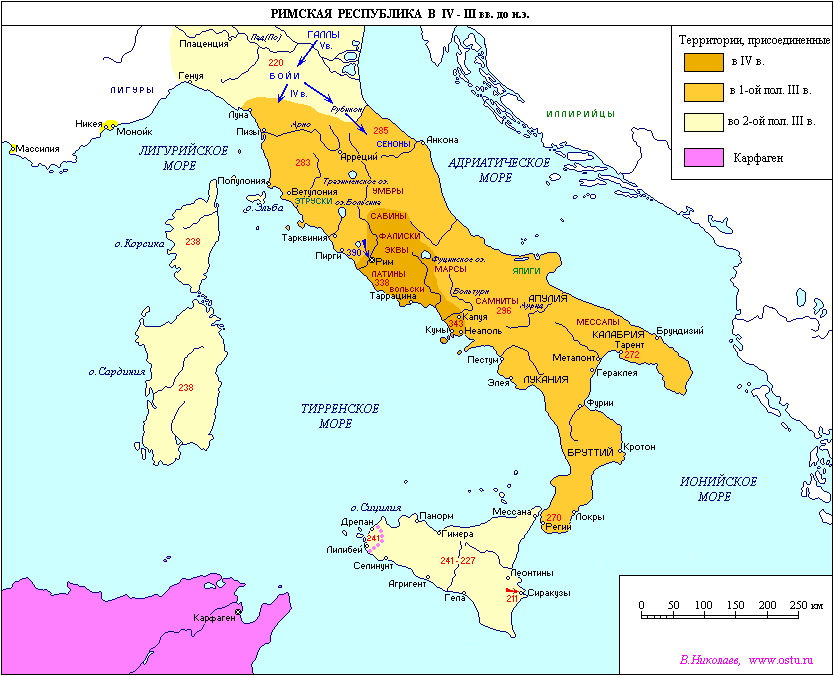 Более интенсивной, однако, была колонизационная деятельность Карфагена, особенно в VI в. до н.э. Результаты ее особенно ощущались на островах – в Западной Сицилии, на Сардинии и на Корсике. Но как показывает этрусско-пунийское святилище в Пирги (совр. Сан-Севера) с этрусскими и пунийскими текстами, карфагеняне пытались закрепиться и на италийском берегу. В самой же Италии финикийско-карфагенский элемент этногенетического значения не имел, чего нельзя сказать о другом народе – этрусках.