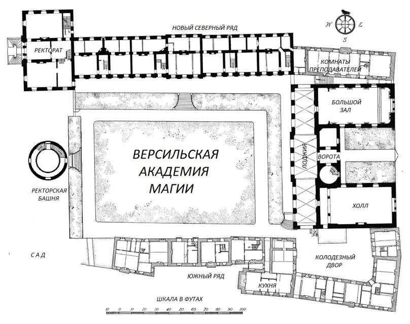 Ну что, увиденное мне понравилось. Во-первых, сразу видно, что учреждение серьёзное. Я стоял во дворе большого каменного «П»– образного здания в три этажа, открытую сторону которого закрывала стена с воротами за моей спиной. Въезд был замощён брусчаткой и вёл к большой арке по центру здания с ещё одними воротами, через распахнутый зев которых виднелась большая открытая площадка и башня за ней. Очень может быть, что как раз моя, ректорская. А под самой крышей здания, под большими круглыми часами, было в камне вырезано название «Версильская академия магии».