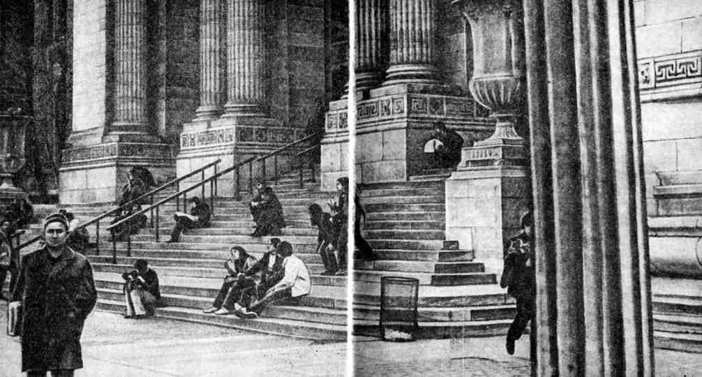 Что происходило в студенческой Америке в последующие 15—20 дней – трудно пересказать. Это надо было видеть своими глазами. Студенты 268 университетов бойкотировали занятия и вышли на улицы городов. В 30 учебных заведениях были разрушены учебные корпуса, где проходили подготовку офицеры запаса. Около 100 студентов объявили голодовку. Многие сели на ступенях Капитолия, перед окнами Белого дома. В парке Лафайетта мы встретились с одним из объявивших голодовку, попросили рассказать, что его побудило пойти на такой крайний шаг.