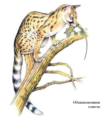 ГЕНЕ́ТЫ, род виверровых. Включает 9—10 видов. Дл. тела 42—58 см, масса 1—3 кг. Окрас светлый с тёмными пятнами, образующими на морде маску, а на спине – ремень. Хвост украшен поперечными чёрными и белыми кольцами. Когти полувтяжные. Активны генеты по ночам. Хорошо лазают по деревьям и охотятся как в кронах деревьев, так и на земле. Питаются мелкими млекопитающими, птицами, рыбой, насекомыми. Ведут одиночный образ жизни. В выводке 2—4 детёныша, они рождаются покрытыми шерстью, но слепыми и глухими. Воспитывает потомство только самка. Охотничьи навыки – врождённые. Территорию помечают запахом. Выделения запаховых желёз (мускус) используют в парфюмерной промышленности.