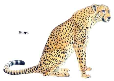 ГЕПА́РД, хищное млекопитающее сем. кошачьих. Самый быстрый зверь на земле (догоняя добычу, развивает скорость до 112 км/ч). Дл. тела до 150 см, выс. в холке до 100 см, дл. хвоста до 75 см, масса до 70 кг. Туловище удлинённое, голова небольшая, с закруглёнными ушами, конечности очень длинные, тонкие, сильные, лапы с невтяжными когтями (исключение для кошачьих). Мягкая, негустая шерсть песочно-жёлтая, с чёрными пятнами. Гепард встречается в саваннах и пустынях Африки. Активен в дневное время. Охотится на антилоп и других диких копытных. Способ охоты для кошачьих не характерен: он незаметно подкрадывается к жертве и, когда до цели остаётся 100—200 м, стрелой бросается в погоню, настигая её через 15—20 с после старта. Если бросок оказался неудачным, прекращает преследование. Беременность длится 84—95 сут, в помёте от 2 до 4 детёнышей. У новорождённых мех серо-голубой, без пятен, на спине пушистая грива. По мере взросления эти «младенческие» особенности исчезают. Гепарды легко переносят неволю и хорошо приручаются. В связи с уменьшением численности диких копытных – основной пищи этих хищников – и сокращением природных мест обитания гепардов осталось очень мало. Вид внесён в Красную книгу МСОП.